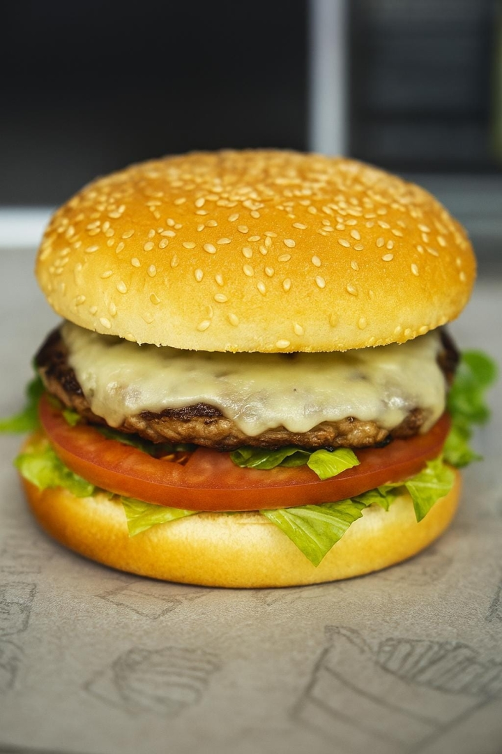Pão de hambúrguer, 3 hamburguês, queijo, alface, tomate e maionese.